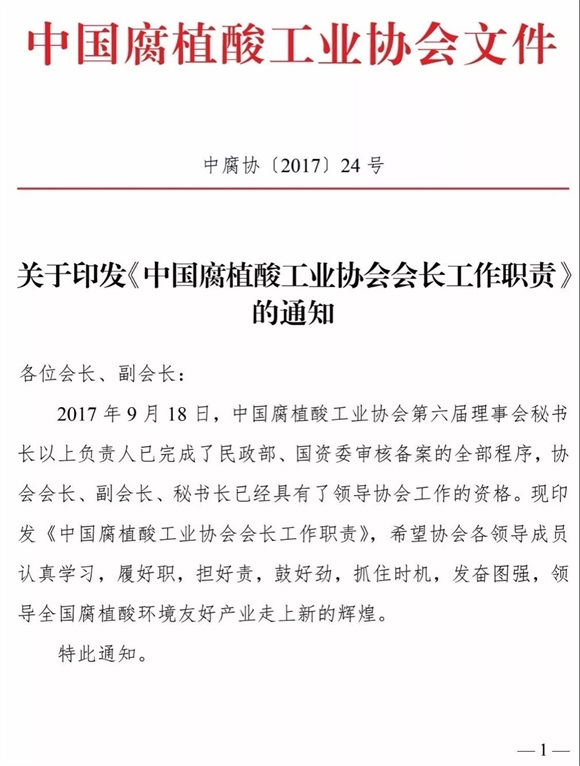 关于印发《中国腐植酸工业协会会长工作职责》的通知
