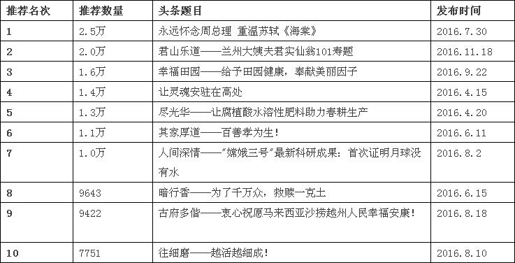 2016年4月11日,“头条号”——“赋予微生更伟大”正式发布腐植酸人文关怀的内容。该“头条号”祈请曾宪成理事长或诗文、或律诗、或对联,赋予了腐植酸人格化,展现了“腐植酸人”的执业情操和人文关怀。截至12月31日,历经八个多月,累计发布头条224篇,获得推荐157篇,推荐率高达70%。其中,推荐数量名列前10名的头条列表如下。