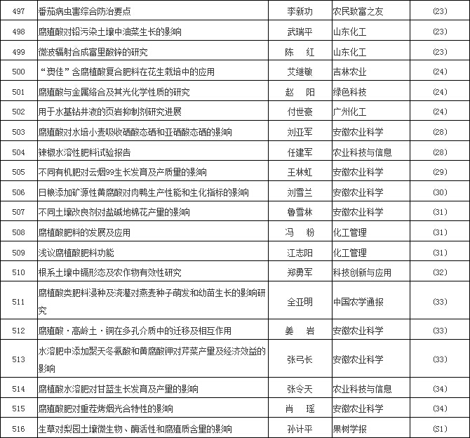【编者按】2016年,腐植酸“美丽因子”,像出水芙蓉一样“净心释爱”,腐植酸文献就是最好的例证。兹依“中国知网”检索,除《腐植酸》杂志外刊物,凡文献摘要中含有腐植酸、腐殖酸、黄腐酸、棕腐酸、黑腐酸、胡敏酸、胡敏素、富里酸、腐殖质等9个关键词者,2016年腐植酸类文献共519篇,较2015年增加31.7%,为近10年腐植酸文献数量之最。现将2016腐植酸文献以序号、文章标题、第一作者、发表刊物和发表期次等五要素编辑刊出,与大家分享。