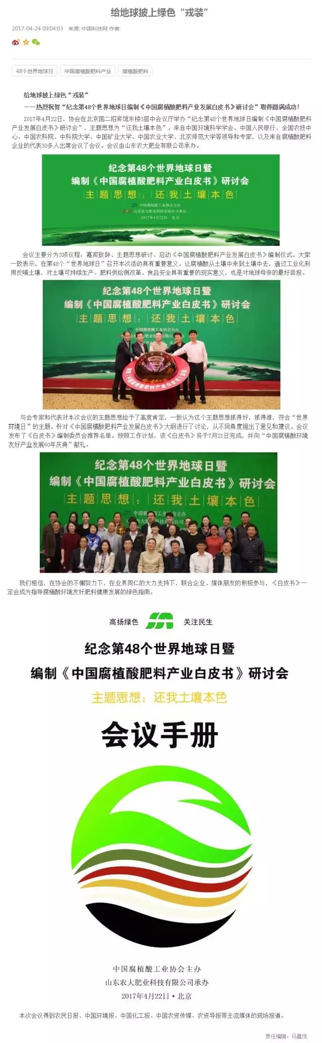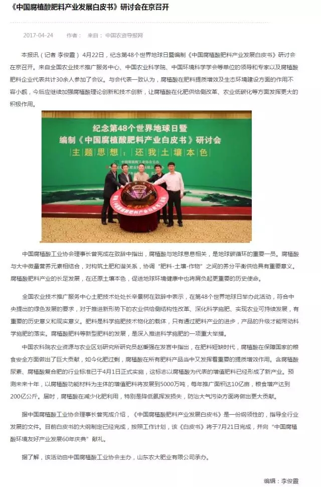 导言:2017年4月22日,“纪念第48个世界地球日编制《中国腐植酸肥料产业发展白皮书》研讨会”在北京国二招宾馆取得圆满成功。今天,集结7家主流媒体专题报道于后,与大家分享。