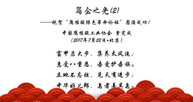 2017年7月22日,为了及时分享在北京人民大会堂“纪念中国腐植酸环境友好产业发展60年庆典”获得的丰硕成果,协会在中国职工之家举办了“腐植酸绿色革命论坛”。该论坛集合了产学研的理论思想、创新技术、产业模式,取得了开展腐植酸绿色革命的新成果。中国腐植酸工业协会名誉会长曾宪成用一句话,依顺序为13位报告人做了简报,并贺诗一首。