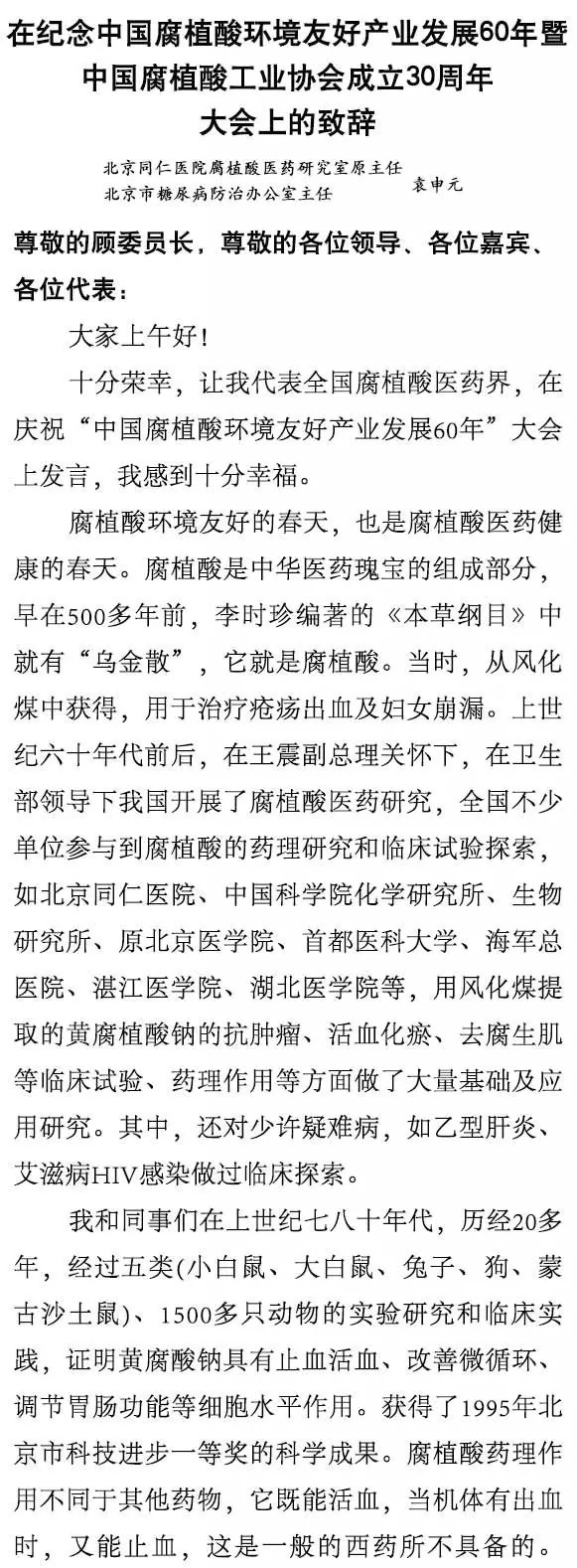导言:2017年7月21日、22日,天风高阔,甘露降临;庆典四象,百般和谐。“纪念中国腐植酸环境友好产业发展60年暨中国腐植酸工业协会成立30周年庆典大会”、“中国腐植酸工业协会第六次会员代表大会”、“腐植酸绿色革命论坛”分别在北京人民大会堂和中国职工之家举行,庆典系列会议取得了圆满成功。今天,编发北京同仁医院腐植酸医药研究室原主任、北京市糖尿病防治办公室主任袁申元在庆典大会上的致辞全文。